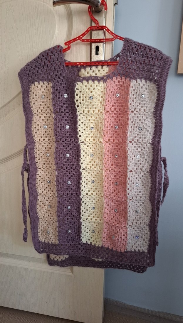Kız çocukları için örme, kolsuz, bol kesim ve bisiklet yaka pelerin. Yumuşak, açık çok renkli ve bohem tarzda, desensiz tasarım.
