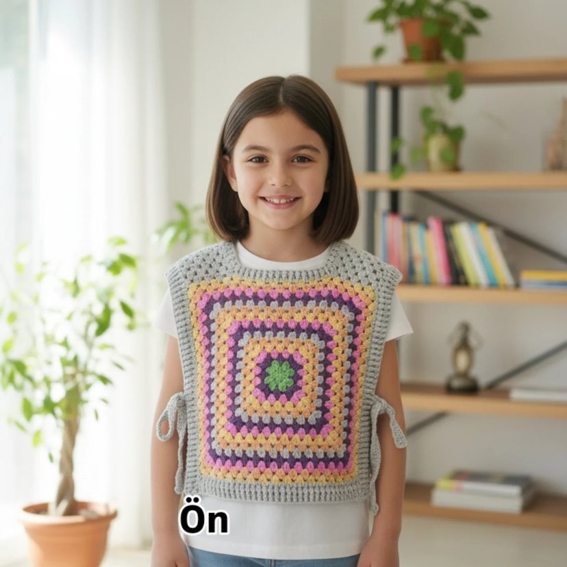 Kız çocukları için çok renkli, örgü dokulu bohem tarzda, salaş kesim ve yuvarlak yaka pelerin. Kolsuz ve retro desenlere sahip.