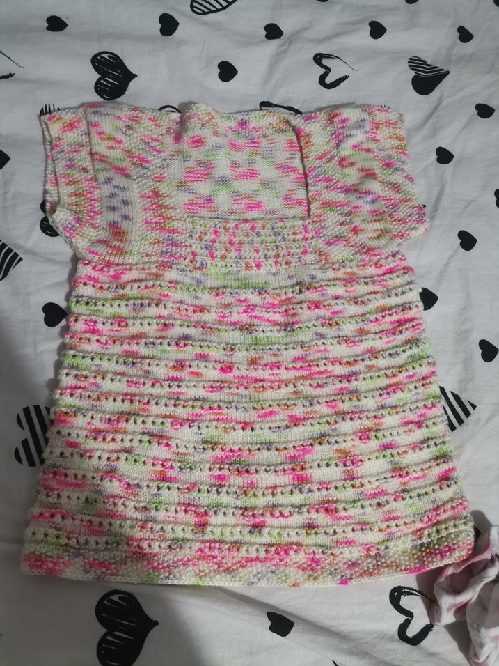 Kız çocukları için kolsuz, kayık yakalı ve bol kesim olan bu yelek, örgü kumaştan yapılmış ve açık renk çok renkli batik desenlidir. 7 8 9 hatta 10 yaşa kadar olur süveter