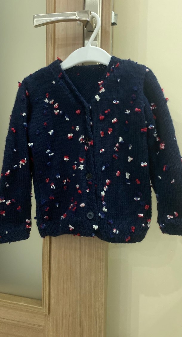 Kız çocuklar için uzun kollu, bol kesim, yumuşak örgüden yapılmış çok renkli detaylara sahip koyu renk hırka. Düğmeli ön kısmı bulunur.