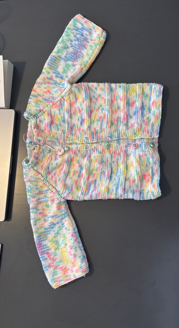 Uzun kollu, çok renkli pastel tonlarda örgü hırka. Önü düğmeli, vücuda oturan kesimde, counterculture tarzında.