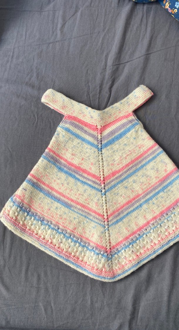 Kız çocuk için bol kesim, V yakalı ve askılı kollu çok renkli pastel örgü panço. Bohem tarzda, desensiz tasarım.