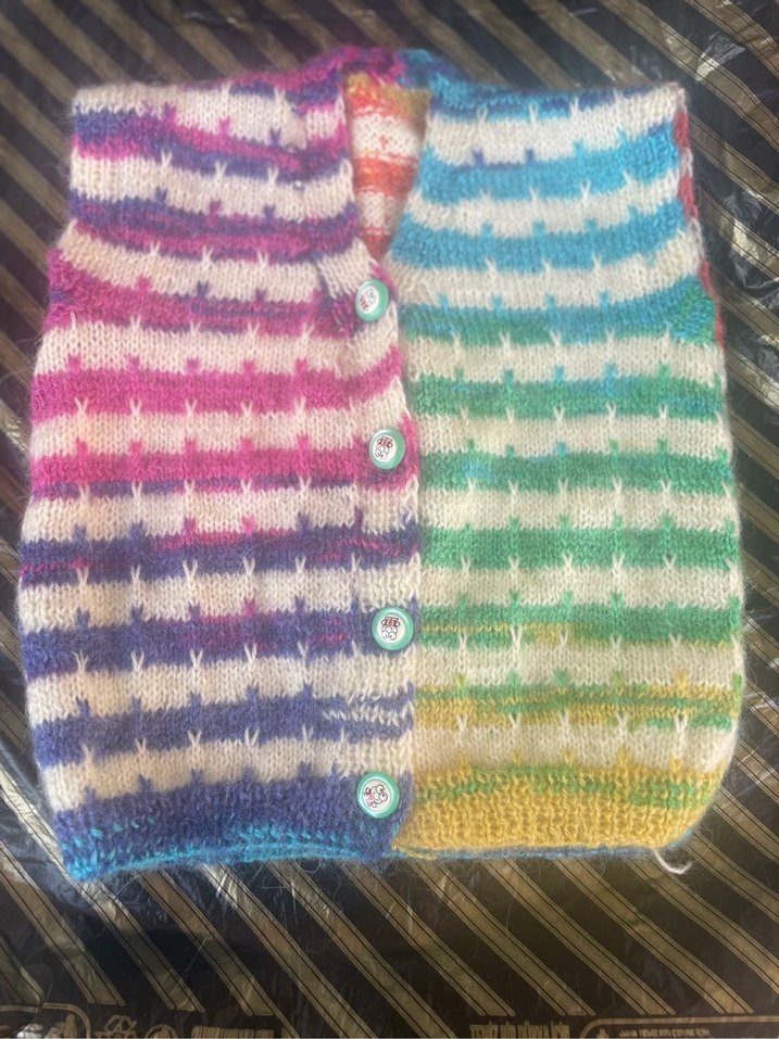 Kız çocuklar için pastel tonlarda çok renkli, düğmeli, örgü ve kolsuz bohem tarzda, vücuda oturan yelek.