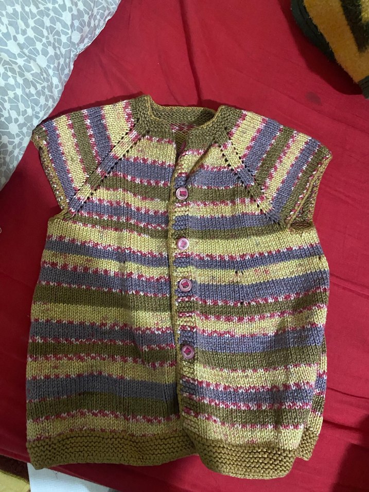 Çok renkli yatay çizgili, düğmeli, askısız yaka ve bol kesim kız çocuk örgü yelek. Bohem tarzını yansıtır.