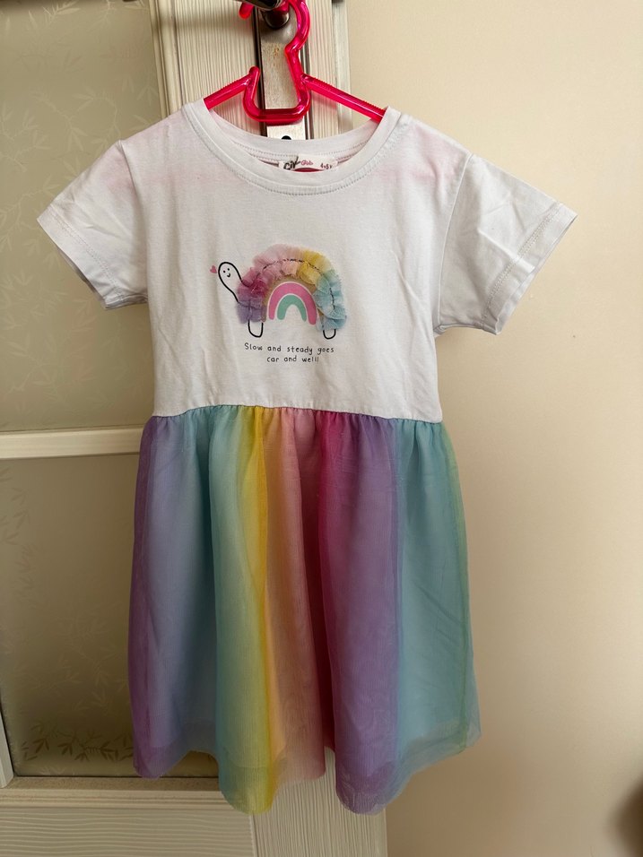 Kız çocuklar için beyaz üst kısmı kaplumbağa ve gökkuşağı baskılı, bol kesim çok renkli pastel tonlarda tie-dye etekli pamuklu elbise. Ruffle detaylı.