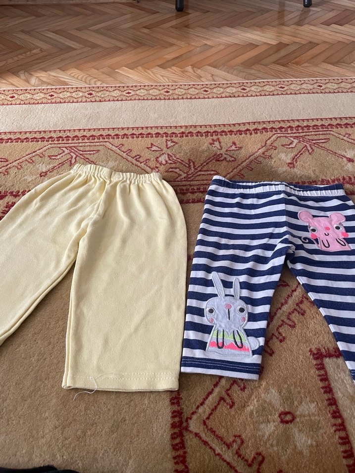 Bu set, yumuşak pamuklu kumaştan yapılmış iki adet dar kesim kız çocuk taytı içerir. Biri düz açık sarı, diğeri mavi-beyaz çizgili ve sevimli hayvan desenlidir. Her ikisi de rahatlık için elastik bel bantlıdır.