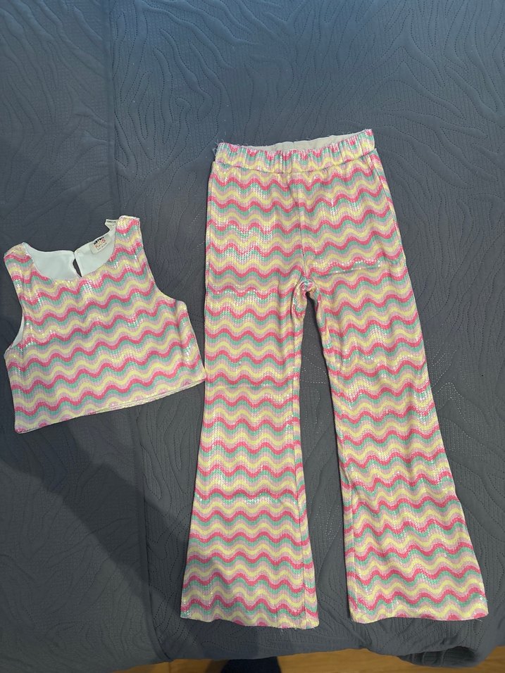 Kız çocukları için payetli, çok renkli crop ve pantolon. Koton 6-7 yaştır