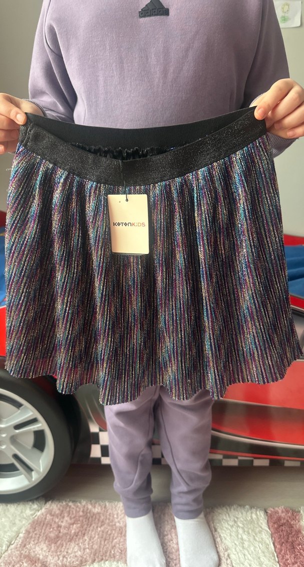 Kız çocuk için çok renkli, pilili ve bol kesim etek. Sentetik kumaştan, sokak modasına uygun tarzda.