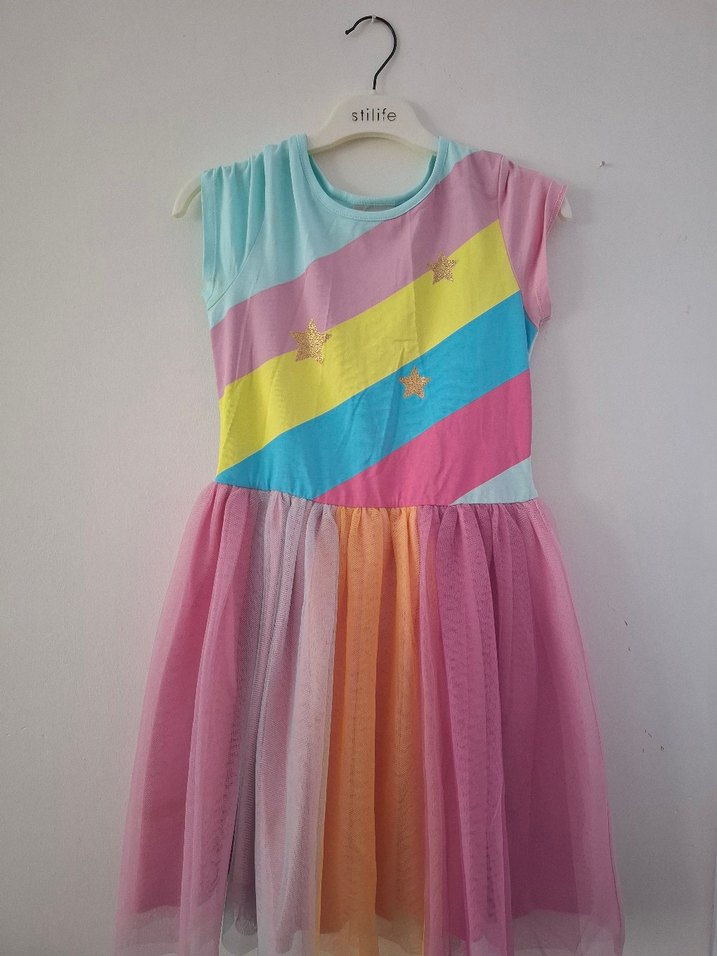 Kolsuz, straplez yakalı, pilili etekli, pastel tonlarda batik desenli yumuşak sentetik kumaştan kız çocuk elbisesi.