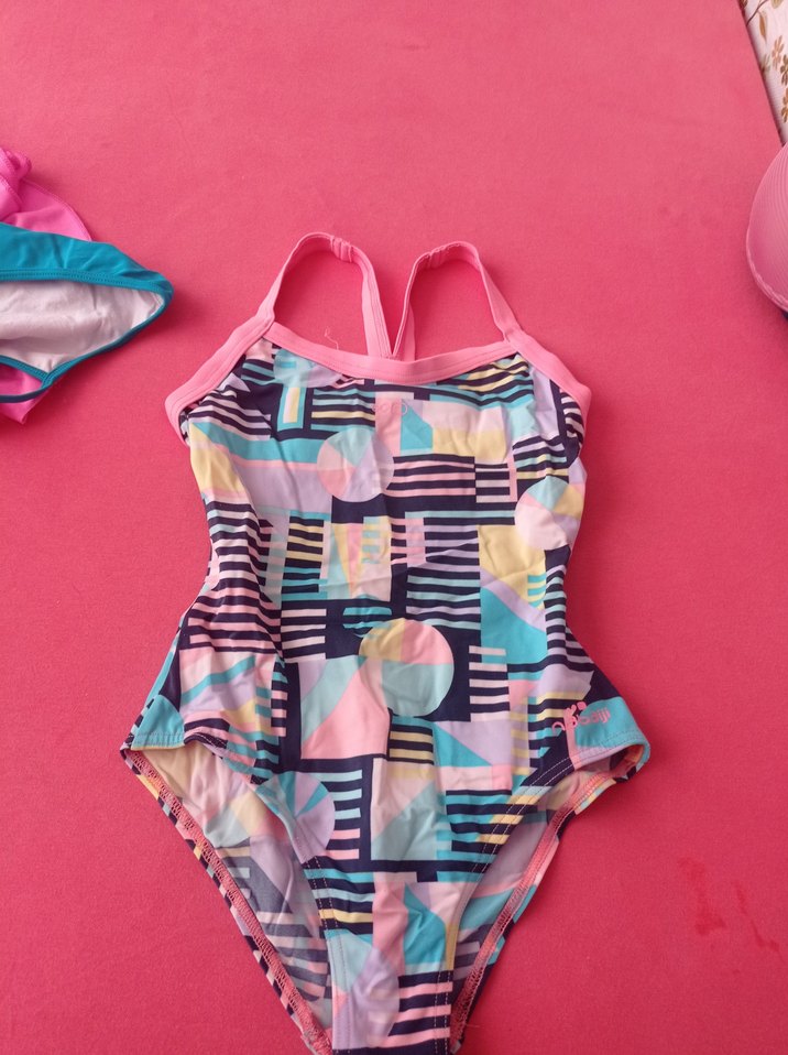 Kız çocuk için askılı, pastel tonlarda bağlama desenli, çok renkli pop art desenli mayo.