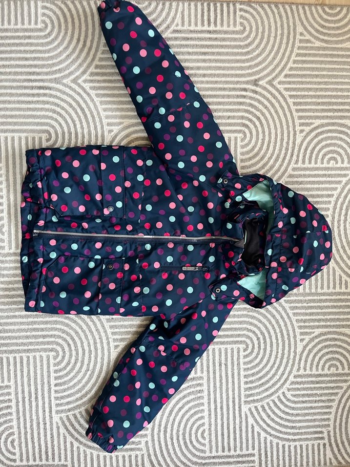 Kız çocukları için çok renkli puantiyeli, fermuarlı, oturan kesim mont. Sentetik kumaştan üretilmiş, sokak stili için uygun.