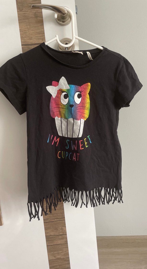 Pamuklu, kısa kollu, siyah tişört. Çok renkli kedi baskısı ve etek kısmında püsküller bulunur. Bohem tarz için uygundur.