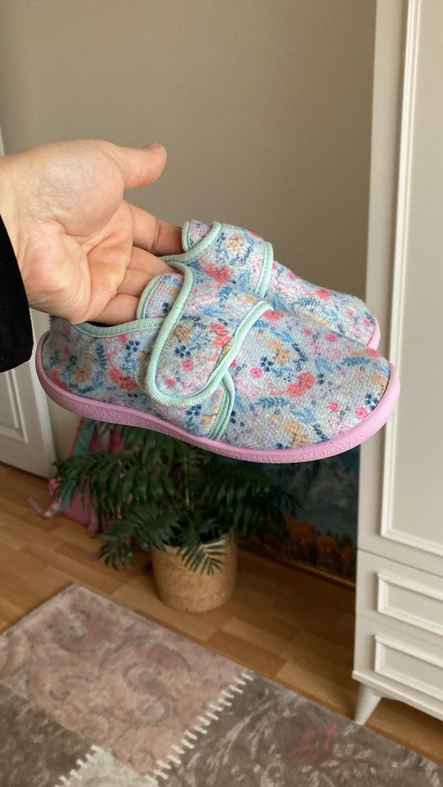 Kız çocukları için çok renkli baskılı, yumuşak, kolay giyilebilen cırt cırtlı sıcak ev terliği.