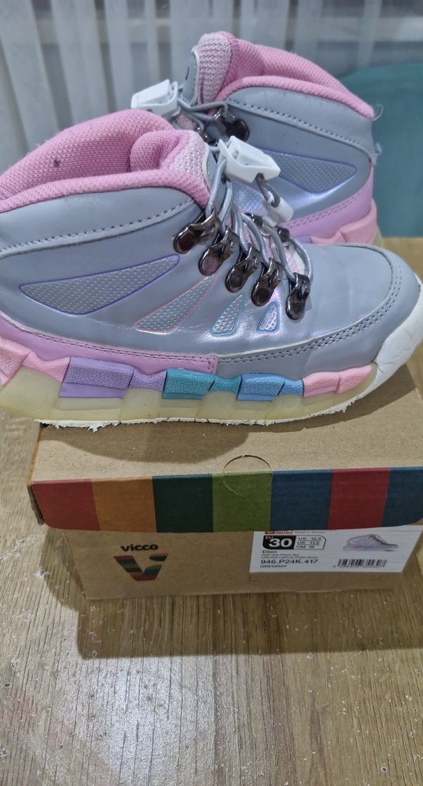 Kız çocukları için çok renkli ve baskılı desenli, velcro kapamalı spor botlar. Dayanıklı kauçuk malzemeden üretilmiştir, trend sokak stiline uygundur. Numara 30. kizimin rahat edip kullandigi hala giyilebilir durumda oldugu bir iki deformesinin oldugu resimlerde bellidir rahat konforlu bir spor bottur