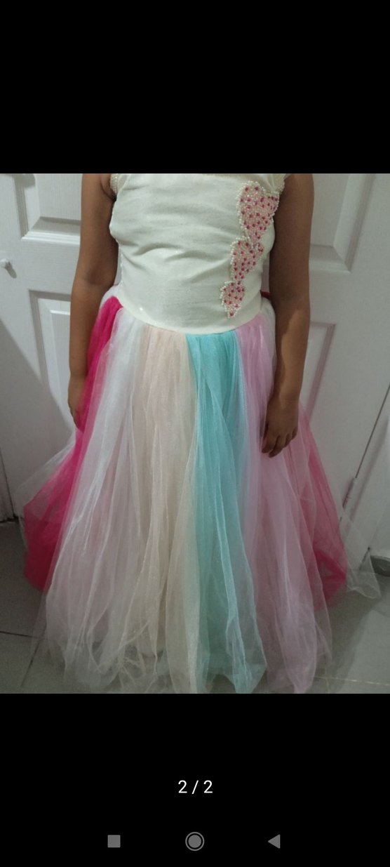 Kolsuz, straplez, vücuda oturan üst kısmı ve fırfırlı, pastel tonlarda tie-dye etekli sentetik kumaş kız çocuk elbisesi.