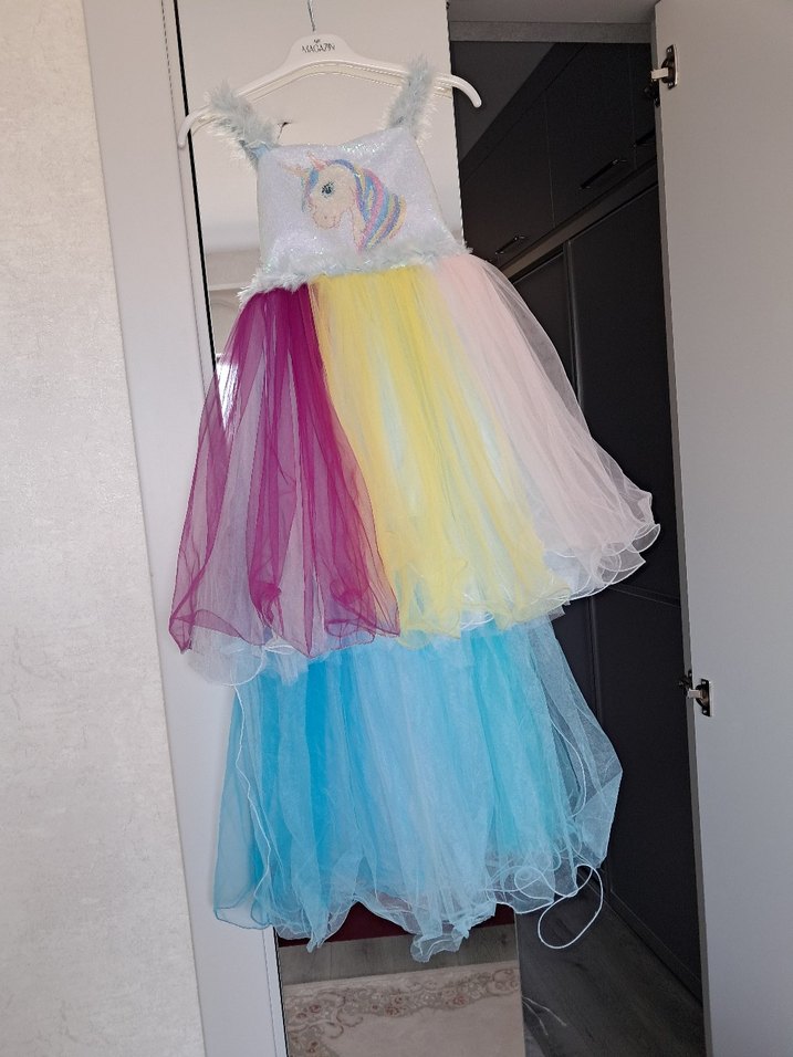 Kız çocuk elbisesi, straplez yakalı ve askılıdır. Tül katmanlar ve fırfır detaylarıyla çok renkli tie-dye desene sahiptir. Üst kısmında sevimli bir unicorn baskısı vardır.