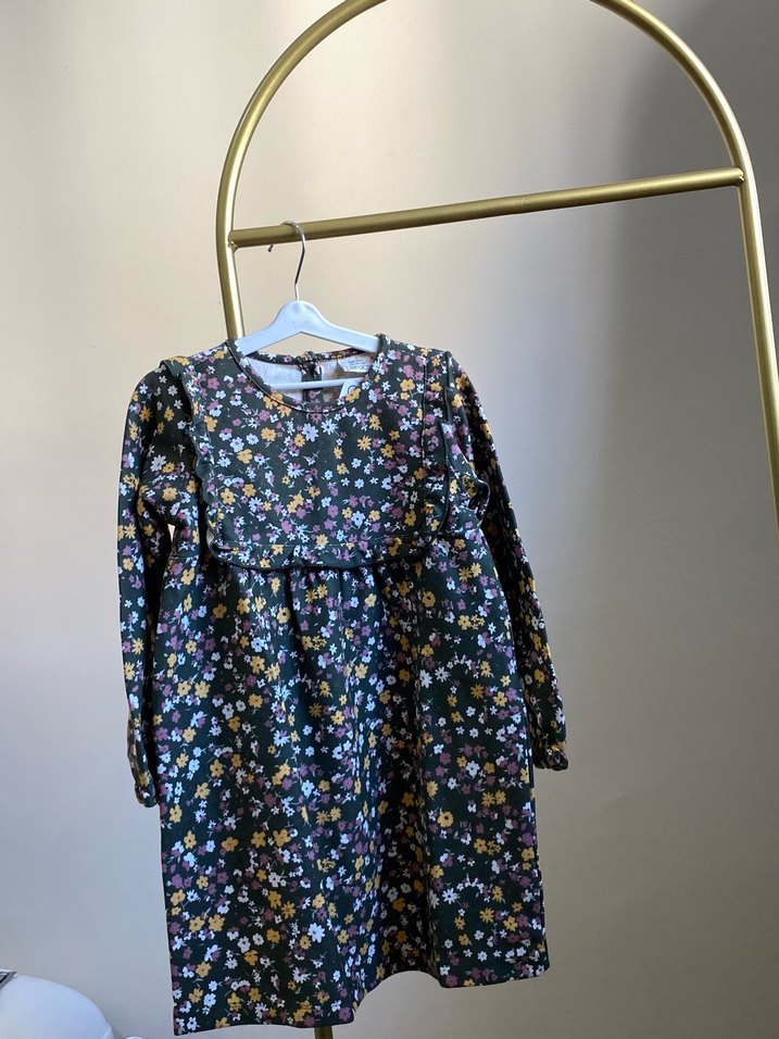 4-5 yaş Kız çocuk elbisesi uzun kollu, bol kesim ve çok renkli çiçek desenlidir. Fırfırlı detay ve yuvarlak yaka ile bohem tarzı yansıtır.