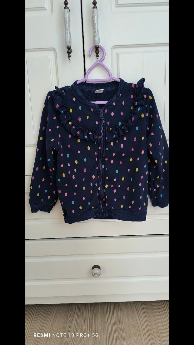 Bol kesim kız çocuk hırkası uzun kollu ve düğmeli. Yumuşak dokulu, koyu zemin üzerinde renkli puantiyeli ve fırfır detaylı, sokak modasına uygun.