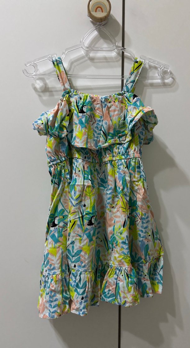 Kız çocuk için askılı, volan detaylı, kolsuz, pastel tonlarda batik desenli, sentetik kumaştan bol kesim bohem tarzı elbise.