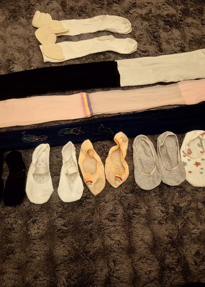 7,8,9 yaş uygun çoraplar külotlu çorapları pentinindir.Pembe ve lacivert olan incedir,siyah olan kalın çoraptır,kanatlı olan diz çorabı,diğerleri babet çorap.Siyah ve beyaz önden lastikli babet çoraplar kullanılmadı,diğer çoraplar kullanılmış iyi durumdalar.