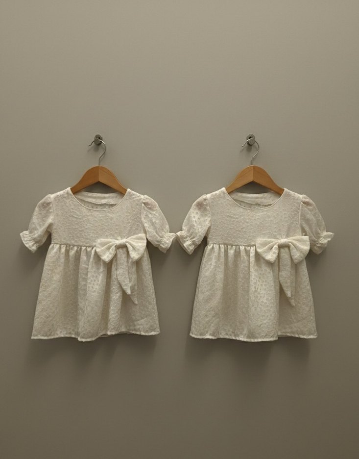 Kız çocukları için kısa kollu, yuvarlak yakalı ve bol kesim elbise. Pamuk kumaştan, işlemeli dantel detaylı ve fiyonk süslemeli, modern klasik tarzda. (kendim dikiyorum)