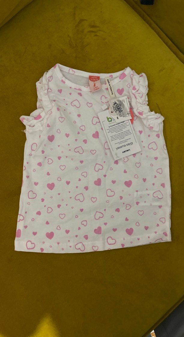 Kız çocuk tişörtü, kısa kollu ve dantel detaylıdır. Pamuk kumaştan, bol kesim ve pastel tonlarda kalp baskılıdır. Yuvarlak yaka ile rahat bir tasarıma sahiptir.