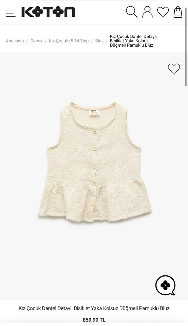 Kolsuz, işlemeli dantel detaylara sahip kız çocuk bluzu. Pamuklu yumuşak kumaştan, yuvarlak yaka ve düğmeli, bol kesim bohem tarzda, pastel beyaz renkte.