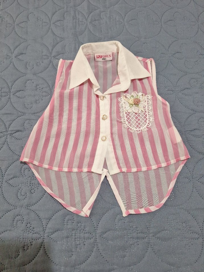 Şifon kumaştan, pastel pembe çizgili, dantel cepli ve yakalı, nakış detaylı, bol kesim kolsuz kız çocuk gömleği.