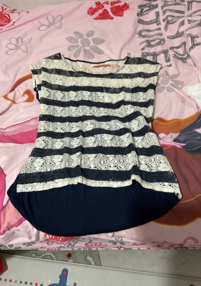 Dantel detaylı, kolsuz ve tekne yaka kesime sahip kız çocuk tişörtü. Sentetik kumaştan, koyu ve beyaz çizgili desende, sokak tarzına uygun.