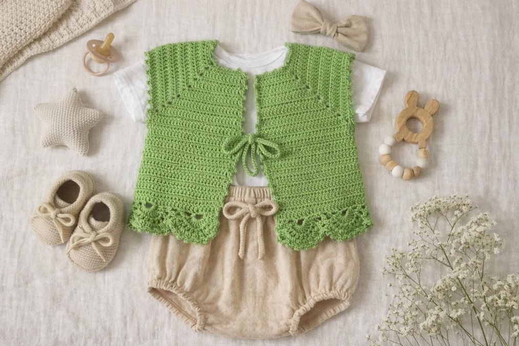 Kız çocukları için dantel detaylı, bol kesim, bohem tarzda yeşil örgü yelek.