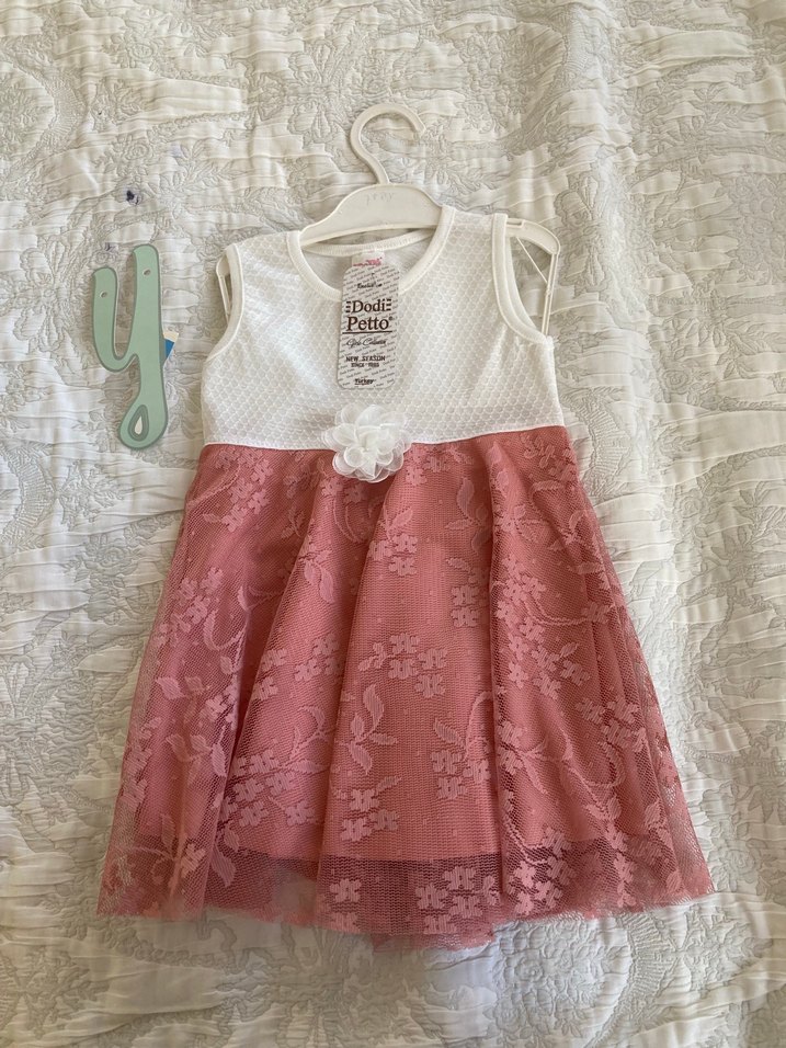 Dantel detaylı, çiçek desenli, pembe renkli, kolsuz ve vücuda oturan kız çocuk elbisesi. Yumuşak sentetik kumaştan, bohem tarzda.