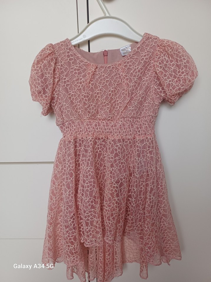 Kısa kollu, bol kesim pembe kız çocuk elbisesi, dantel detaylıdır. V yakalı, bohem tarzda ve yumuşak sentetik kumaştan üretilmiştir. 1 kez düğünde giydi kizim