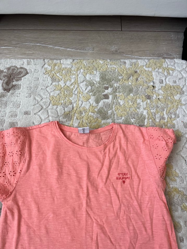 Pamuklu, dantel detaylı kısa kollu pembe tişört, bol kesim ve işleme "Stay Happy" Almanya’dan gelmiştir kalitelidir kız çocuklarına uygun