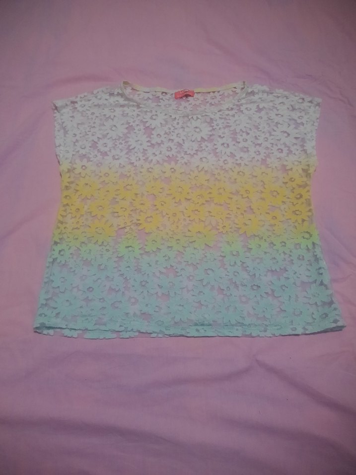 Kız çocukları için pastel batik desenli, dantel detaylı bol kesim bluz. Kısa kollu ve kayık yaka, yumuşak sentetik kumaştan üretilmiştir.