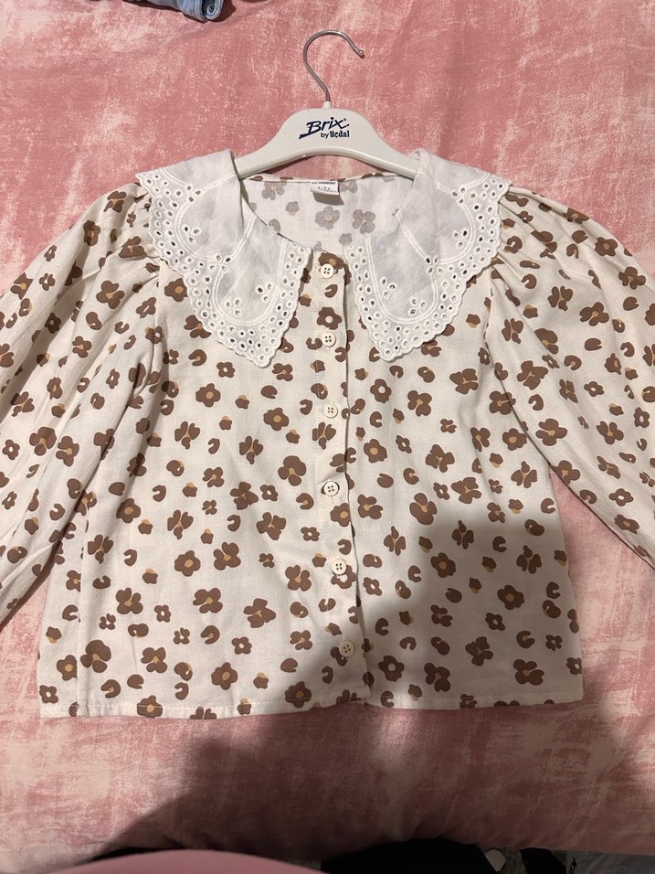 Krem renkli, pamuklu, bol kesim kız çocuk bluz. Dantel detaylı yakası, uzun kolları ve baskılı deseniyle bohem tarzını yansıtıyor.