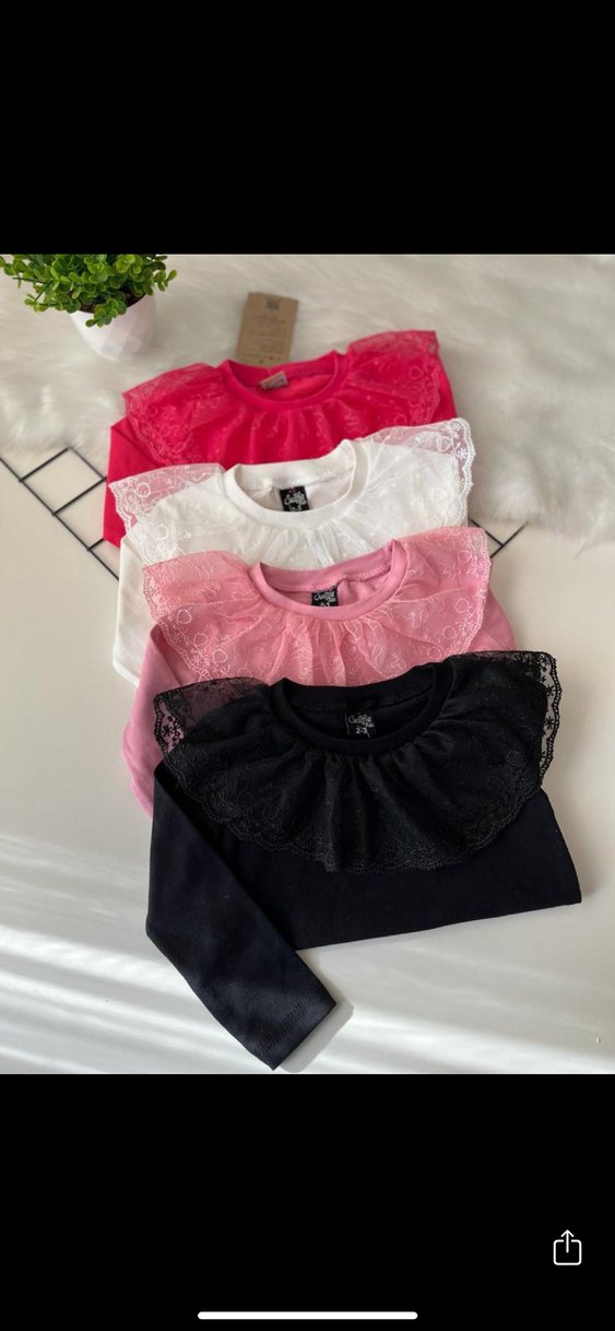 Pamuklu, dar kesim, uzun kollu kız çocuk bluz. Dantel işlemeli ve yuvarlak yaka detaylı, koyu pembe, siyah, beyaz ve açık pembe renklerde. Pembe 3/4 Fuşya 5/6 yaş kaldı adet fiyatı 250₺