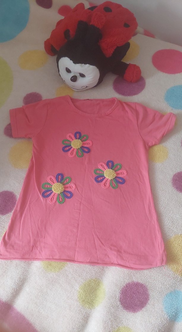 Pembe renk, kısa kollu tişört, yuvarlak yaka ve renkli çiçek desenli dantel detaylarına sahiptir. Rahat kesimi ve yumuşak kumaşıyla bohem tarzına uygundur.