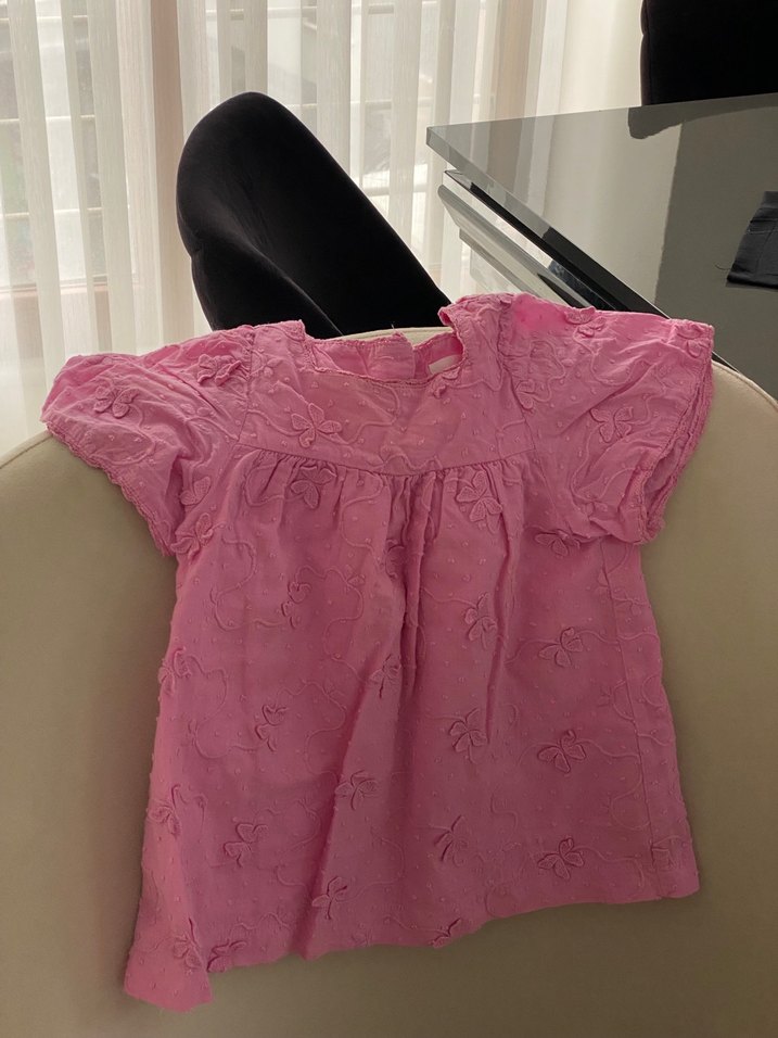 Keten kumaştan yapılmış, kısa kollu, V yakalı ve dantel detaylı pembe renkli bol kesim kız çocuk elbisesi.