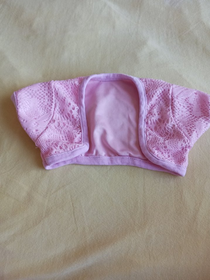 Kız çocuklar için pembe dantelli örme kumaştan, straplez ve askılı kollu, bohem tarzda, vücuda oturan bolero.