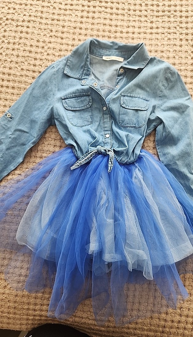 Kız çocuk için fitted kesim, denim üst kısmı notched lapel yakalı ve uzun kollu, pastel mavi tie-dye desenli fırfırlı etek ile bohem tarzda elbise En son resimde Etek kısmında belli belirsiz bir yırtık var resimlerde gösterdim