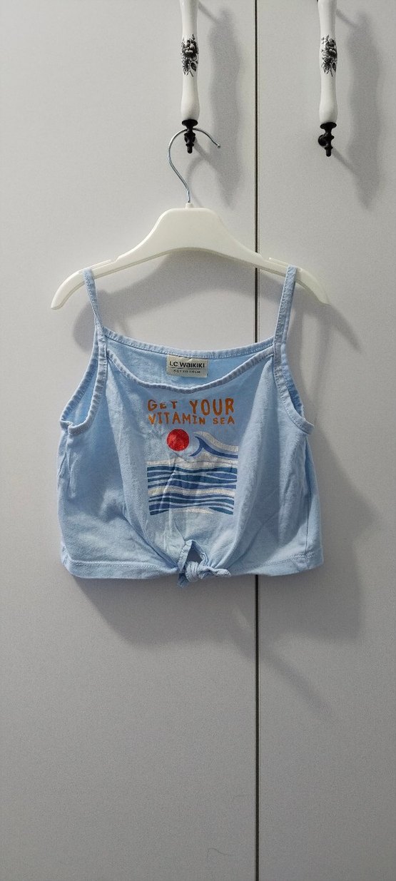 Kız çocukları için kolye yaka, düğmeli, baskılı, bol kesim denim crop top. Pastel mavi renk ve rahat tarz sunar.