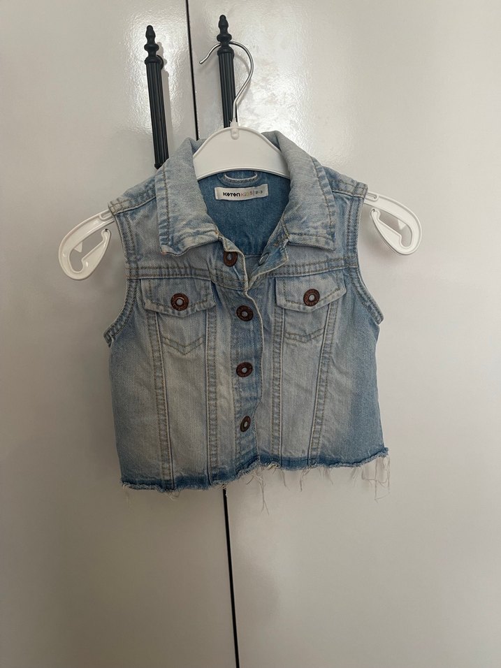 Kız çocuklar için düğmeli, yakalı ve kolsuz, mavi-gri batik desenli, fitted kesim denim yelek. Trend sokak stili için uygundur. Bir defa giyildi sadece