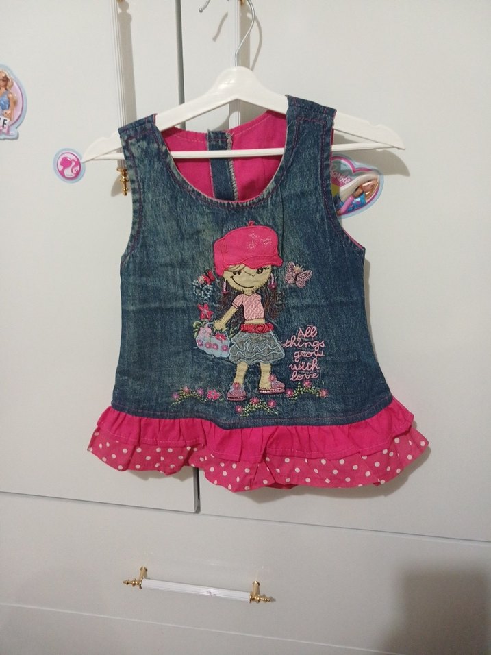 Kolsuz denim elbise, renkli baskılı ve fitted kesimlidir. Pembe fırfırlı etek ucu ve straplez yakaya sahiptir. Trendy casual tarzda. 9 12 aya uyumludur. yenidir. ihtiyaç fazlası
