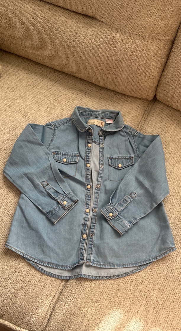2-3 yaş Kız çocuklar için uzun kollu, düğmeli ve denim gömlek. Notlu yaka ve ön cep detaylarıyla sokak stiline uygun.
