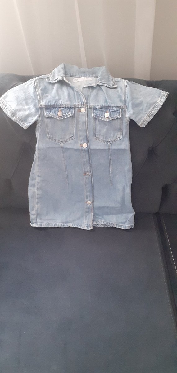 Kız çocukları için bol kesim, kısa kollu, düğmeli ve yakalı denim gömlek. İki cep detaylı, mavi-gri renkli şık bir parça.