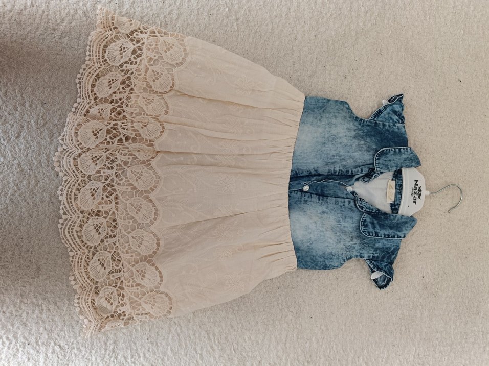 Kız çocuklar için dar kesim, kolsuz elbise, denim ve bej dantel kumaş birleşimi. Askısız yakası ve nakışlı detaylarıyla bohem tarzını yansıtıyor.
