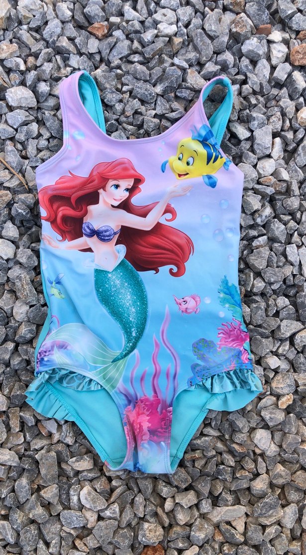 Kız çocukları için kolyessiz, deniz kızı ve balık baskılı renkli mayo. Kalçalarda fırfır detayları bulunur. ♀️