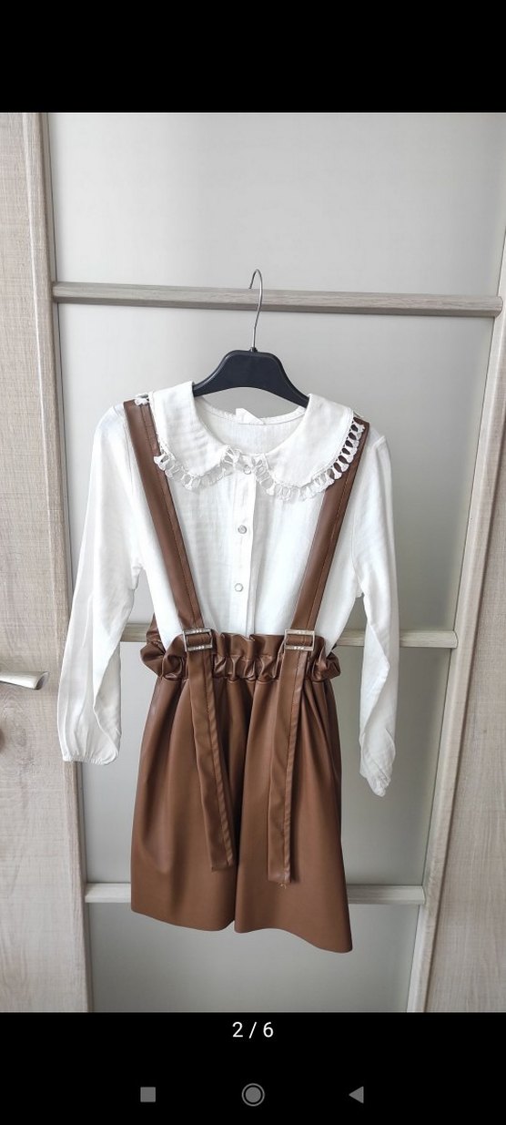 Kız çocuklar için uzun kollu, yakalı, kemerli ve deri askılı etekli bol kesim elbise, pastel bej renkte.