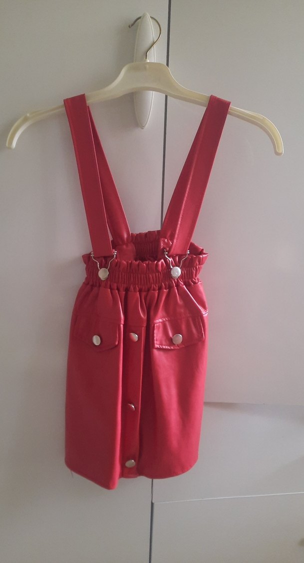 Parlak kırmızı deri kumaştan, düğmeli ve askılı, dar kesim kız çocuk elbisesi.