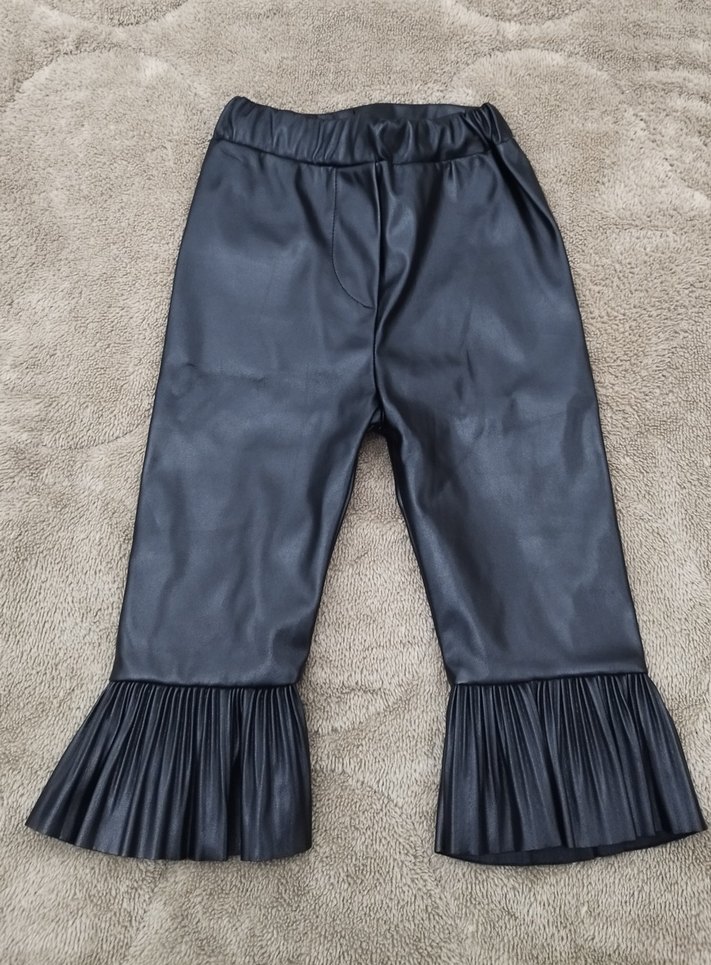 deri kumaştan, bol kesim ve pile detaylı kız çocuk pantolonu. Sokak modasına uygun rahat bir model.